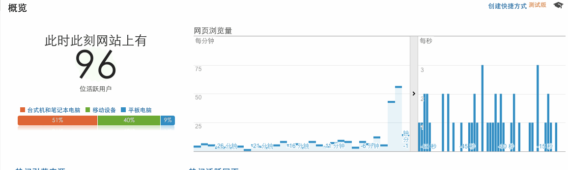 实时监控类:侧重于短时间内数据呈现,不展示当天的累计数据,如 Google Analytics, Gosquared, Chartbeat, Kissmetric 等