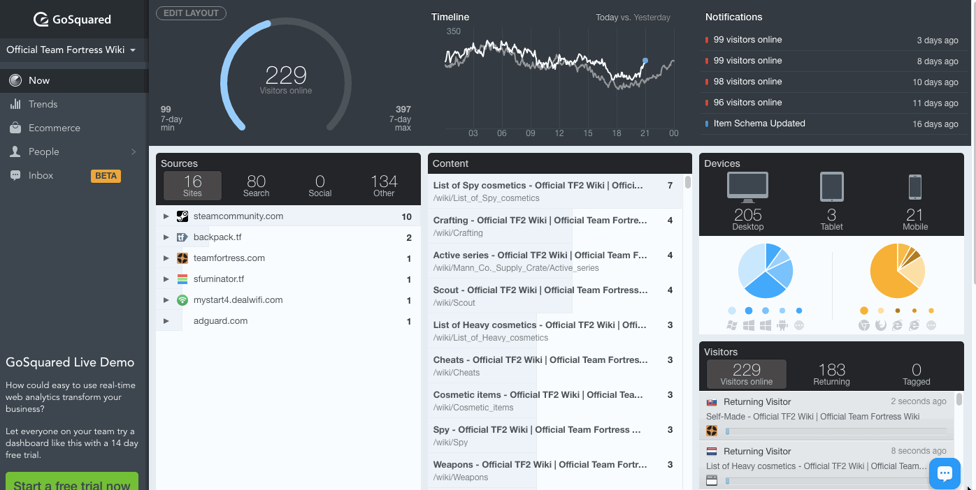 Gosquared 是一个成立于 2006 年的老牌厂商(从它的界面就可以看出来了),主要卖点就是实时功能。它可以追踪到6h内所有用户的访问内容和使用细节, 在及时性和全面性都做得不错。 同时,它在很多细节上可圈可点,如直接将当前访客数显示在网页标签上,这样即使你在浏览其他网页也能监控到自己网站的访客数量。