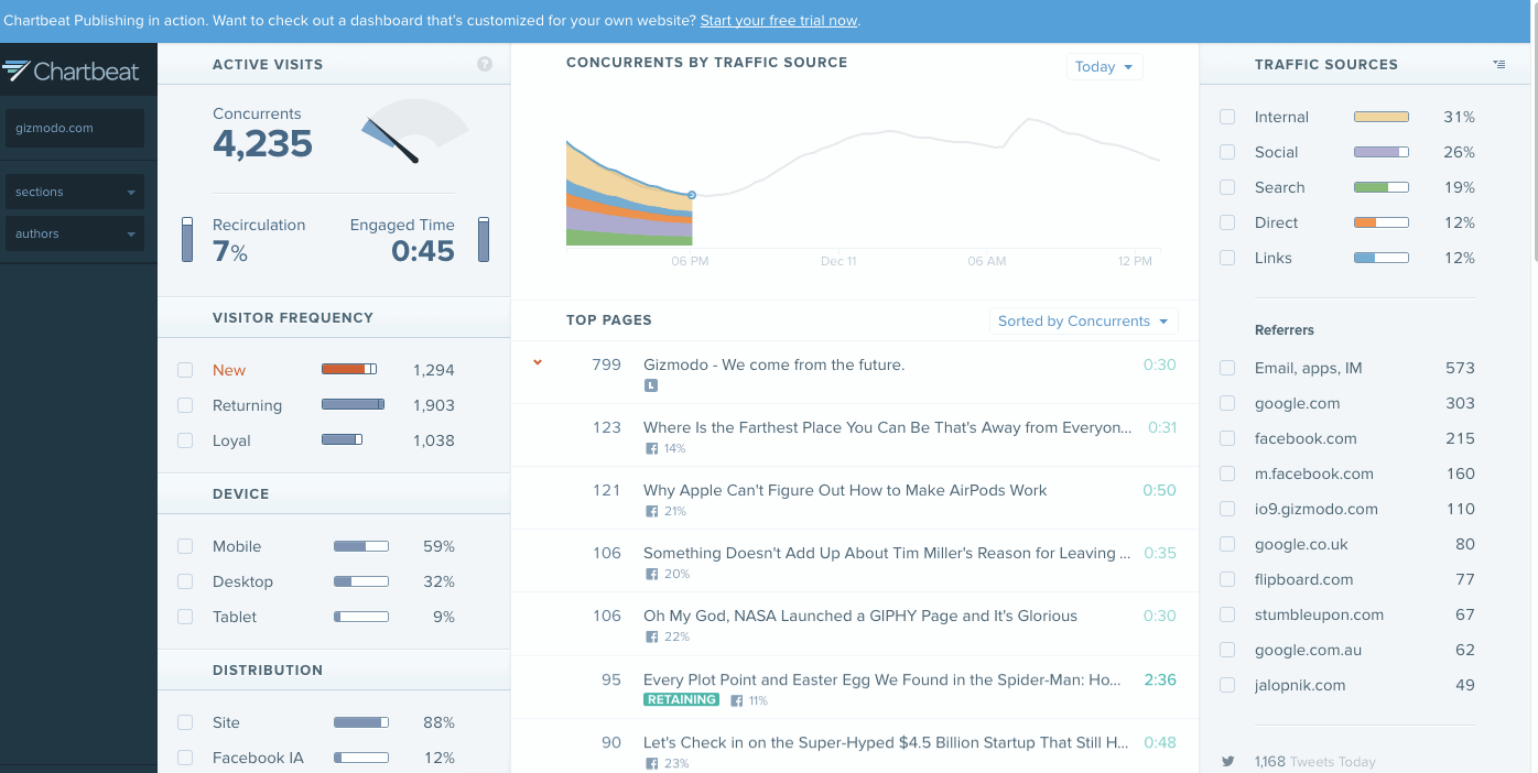 Chartbeat 是一个主要服务于在线新闻和文章监控的公司,产品定位在口号十分明确:Your audience's attention is worth more than their clicks. 它以实时展现访问内容为主,并根据每条内容显示访问来源及其比例。所以基本上能够锁定住每发一篇文章,效果如何一眼便知,根据数据情况快速修改发布。