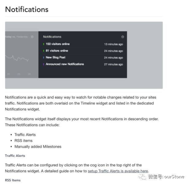 可以设定流量提醒,RSS提醒和增加里程碑点来记录数据的变化。订阅提醒支持推特/博客/Github 等内容更新订阅