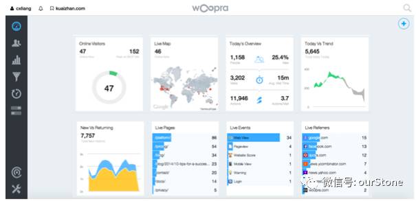 - Woopra:主打定制化的图表 Widget,以实现更加灵活的数据分析。实时模块也遵循了这个思路。